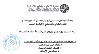 لائحة الموظفين المدعوّين لاجتياز الاختبار الشفوي لولوج ماستر : النص الشرعي والمجتمع (التوقيت الميسر) (2025-2026)