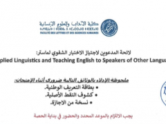 وسيعلن بموقع الكلية و المنصة الالكترونية للتسجيل في الدكتوراه للجامعة عن تواريخ و مكان اجتياز المباريات (الكتابية والشفاهية حسب خيارات المختبرات وفرق البحث).