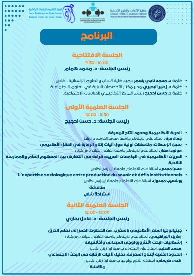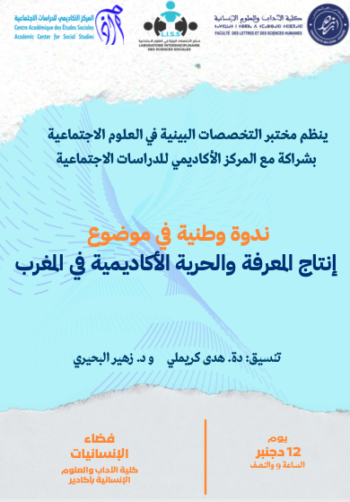 ينظّم مختبر التخصصات البينية في العلوم الاجتماعية بشراكة مع المركز الأكاديمي للدراسات الاجتماعية ندوة وطنية في موضوع ”إنتاج المعرفة والحرية الأكاديمية في المغرب”، وذلك يوم الجمعة 12 دجنبر 2025 على الساعة التاسعة والنصف صباحا، بفضاء الإنسانيات-كلية الآداب والعلوم الإنسانية بأكادير.