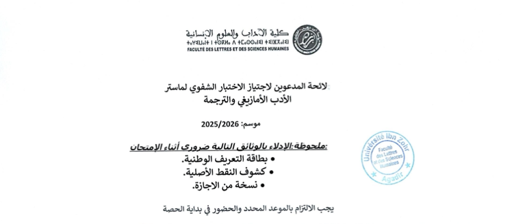 لائحة الطلبة المدعوّين لاجتياز الاختبار الشفوي لولوج ماستر : الادب الأمازيغي والترجمة (2025-2026)