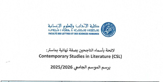 لائحة بأسماء الناجحين بصفة نهائية بماستر : Contemporary Studies in Literature (CSL)
