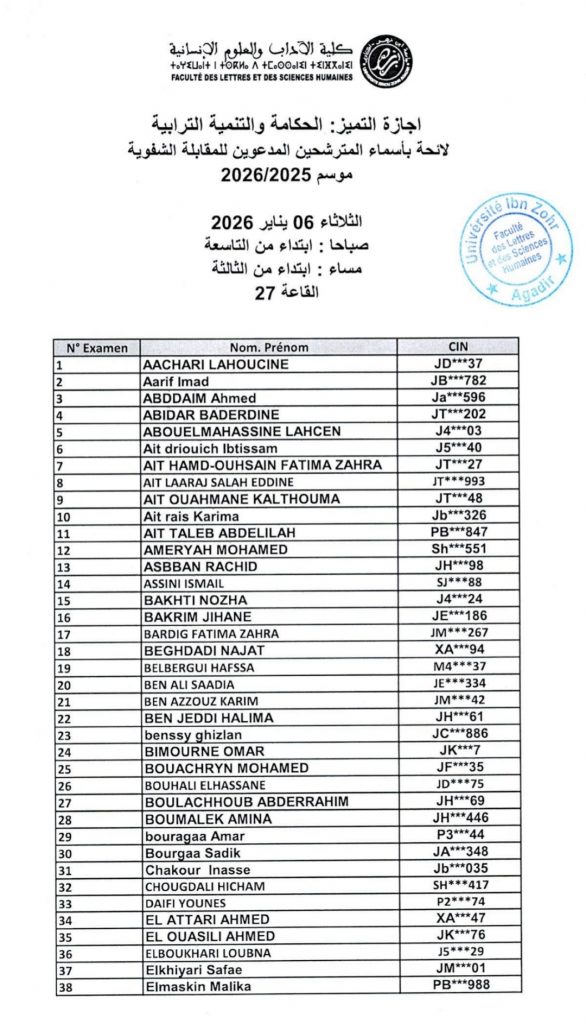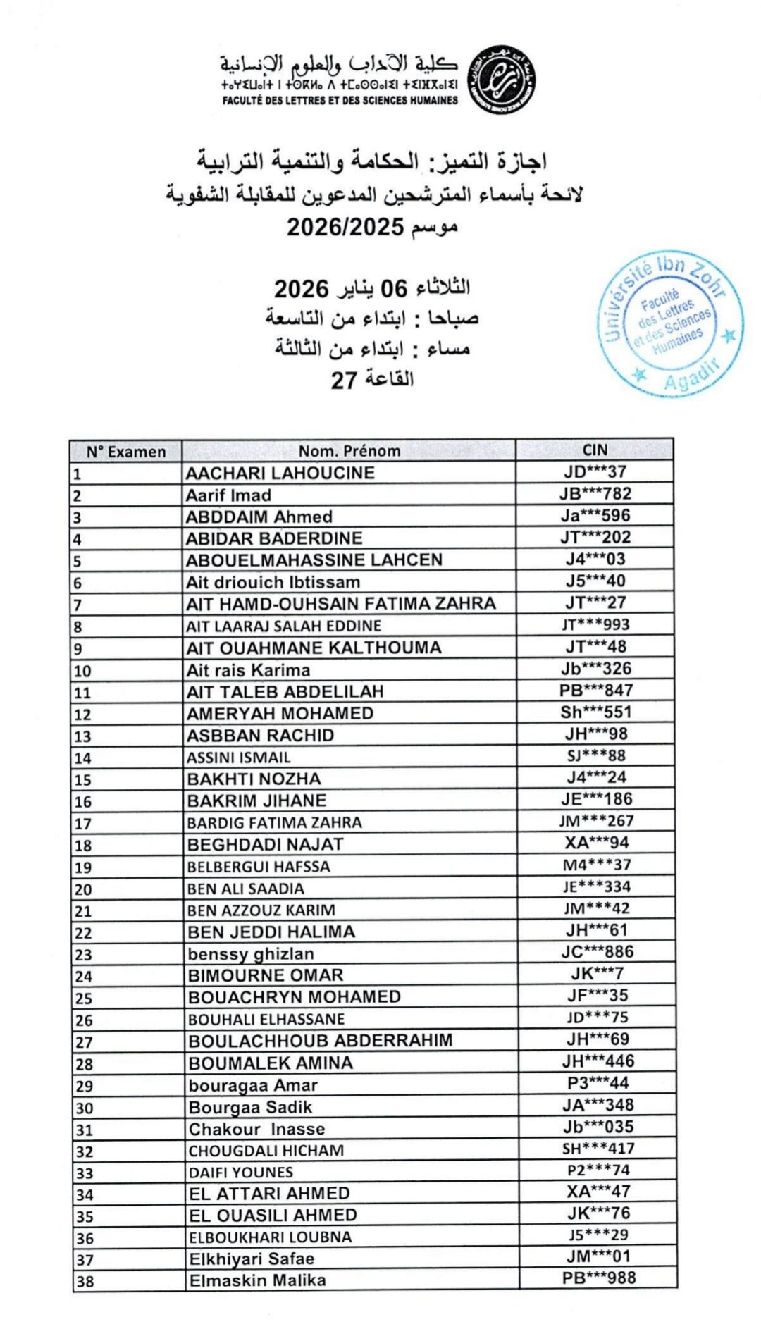 لائحة بأسماء المترشحين المدعوين للمقابلة الشفوية : إجازة التميز الحكامة والتنمية الترابية
