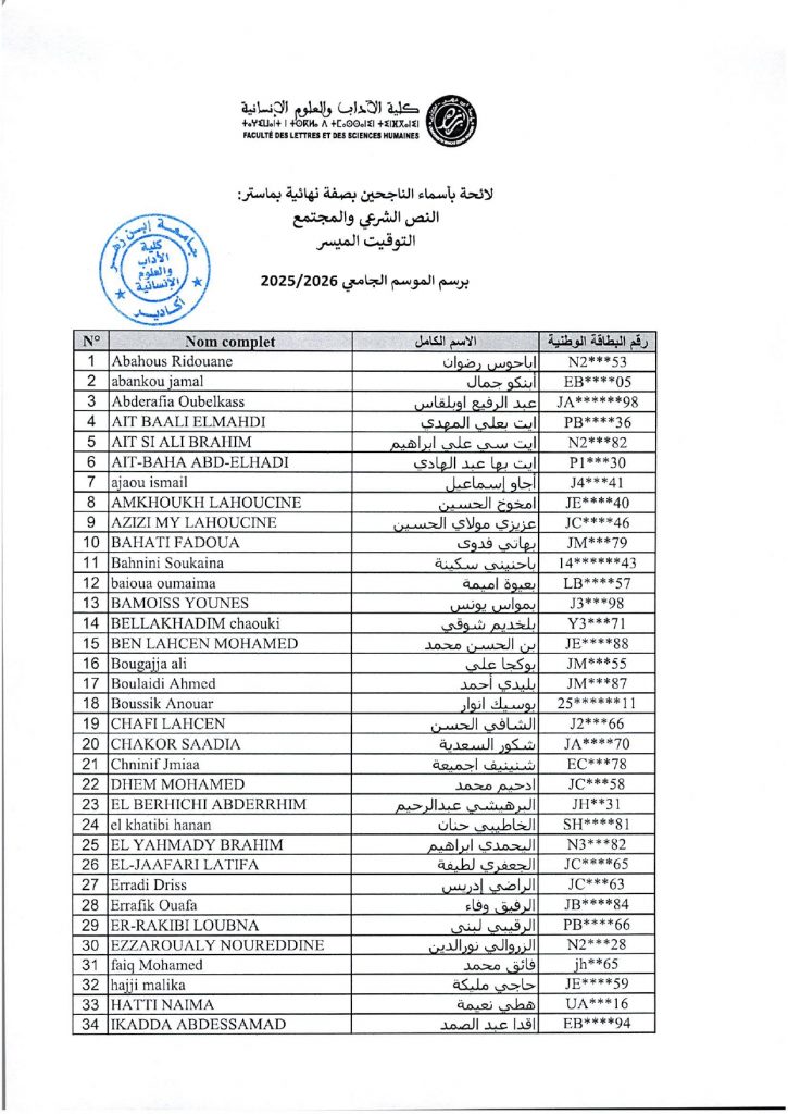 لائحة بأسماء الناجحين بصفة نهائية بماستر النص الشرعي والمجتمع التوقيت الميسر