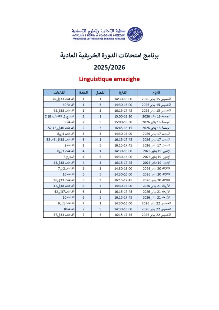برنامج امتحانات الدورة الخريفية العادية : Linguistique amazighe / Littérature amazighe