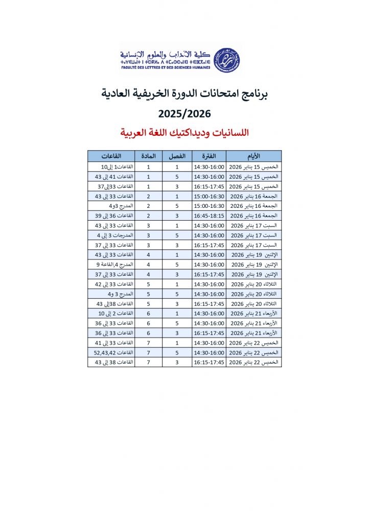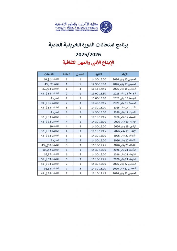 برنامج امتحانات الدورة الخريفية العادية: اللسانيات وديداكتيك اللغة العربية / الإبداع الأدبي والمهن الثقافية
