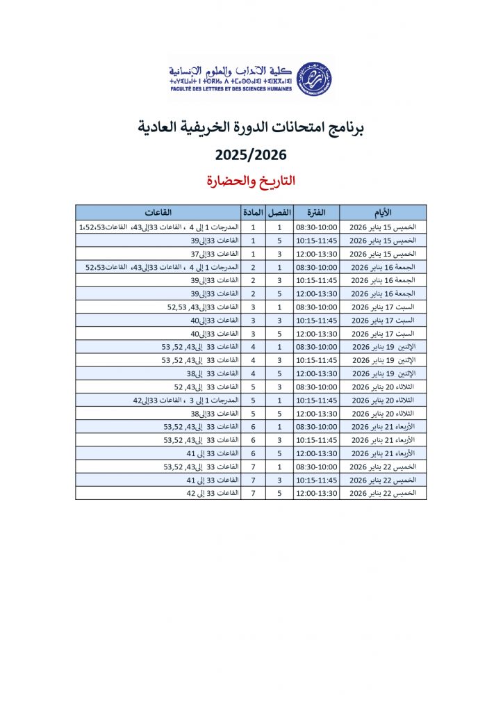 برنامج امتحانات الدورة الخريفية العادية : التاريخ والحضارة