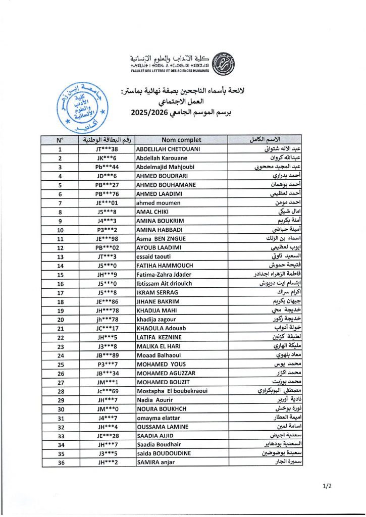 لائحة بأسماء الناجحين بصفة نهائية بماستر : العمل الاجتماعي 2025 – 2026