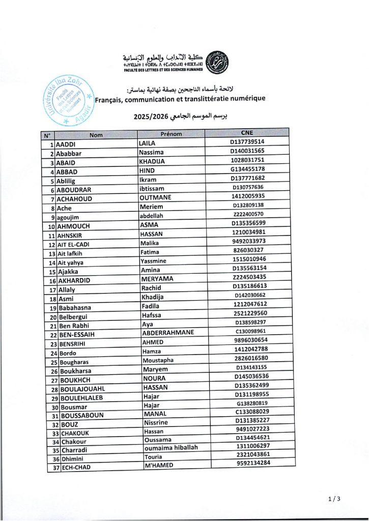 لائحة بأسماء الناجحين بصفة نهائية بماستر : Français, communication et translittératie numérique 2025 – 2026