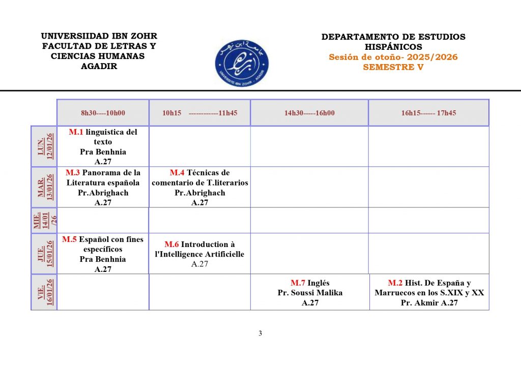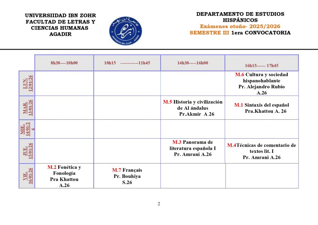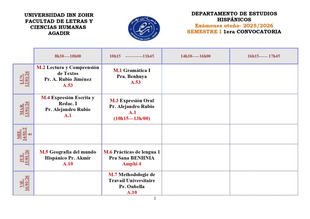 برنامج امتحانات الدورة الخريفية العادية : Filología Hispánica 2025-2026