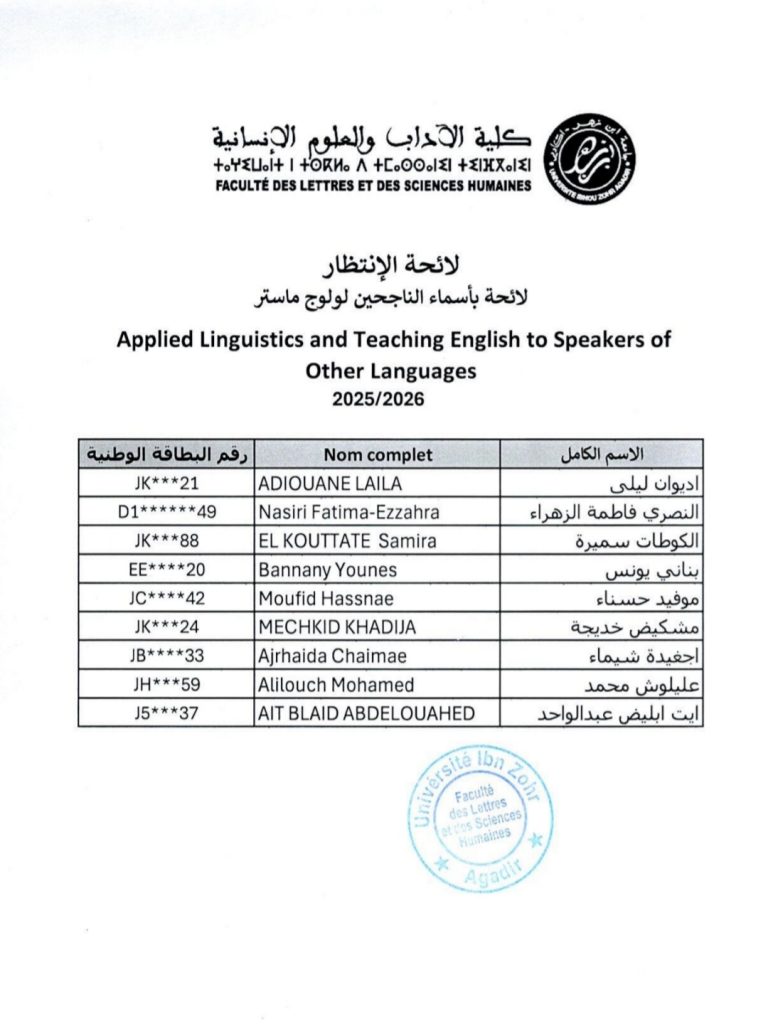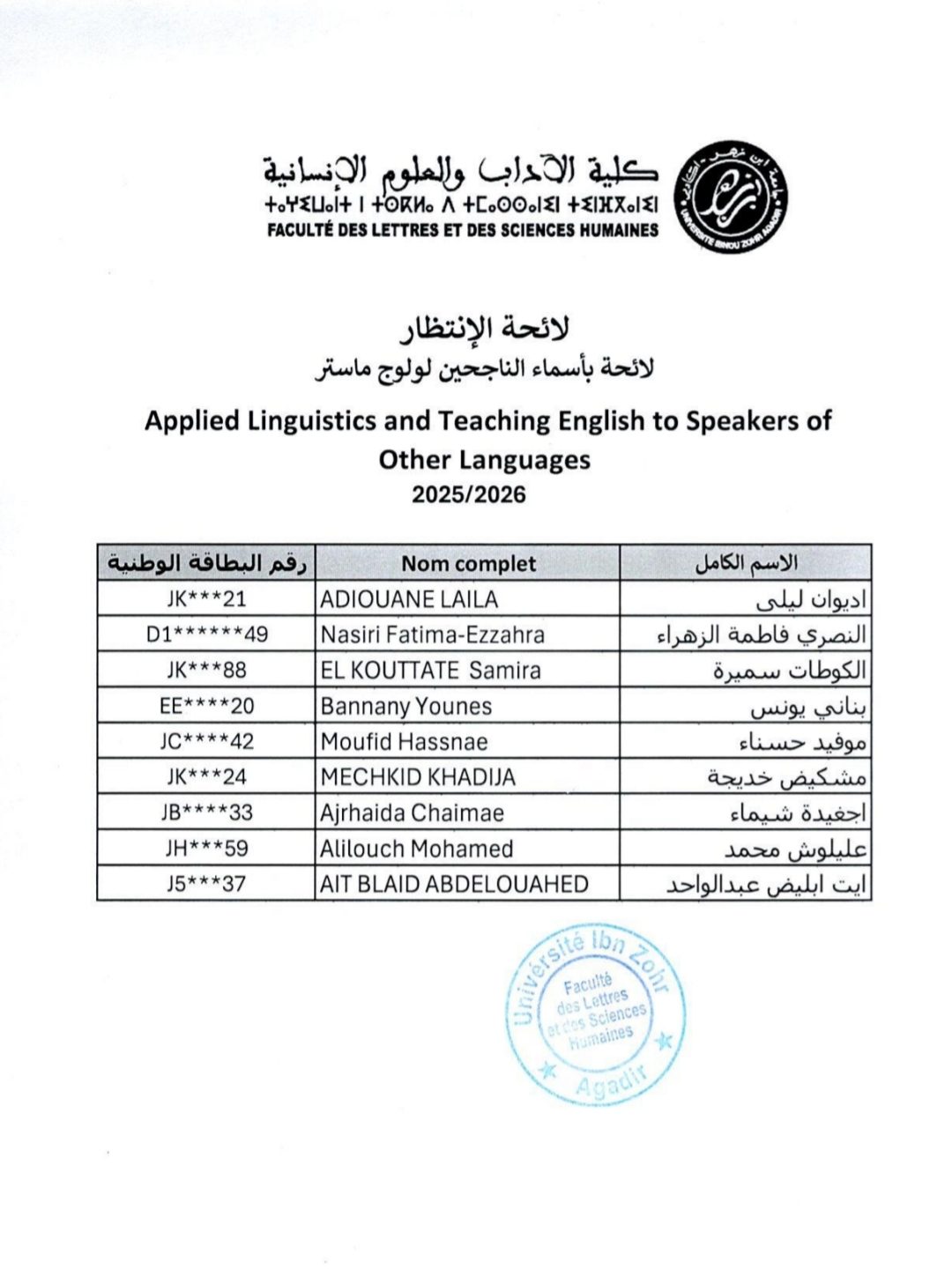 لائحة الانتظار ماستر : Applied linguistics and teaching English to speakers of other languages
