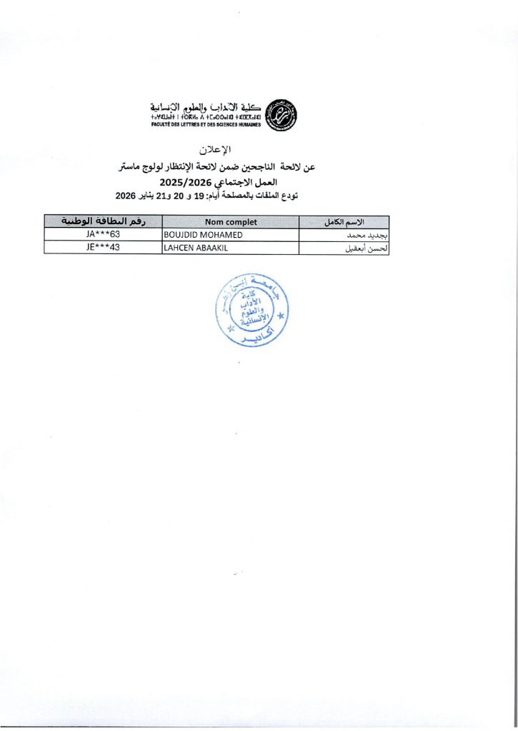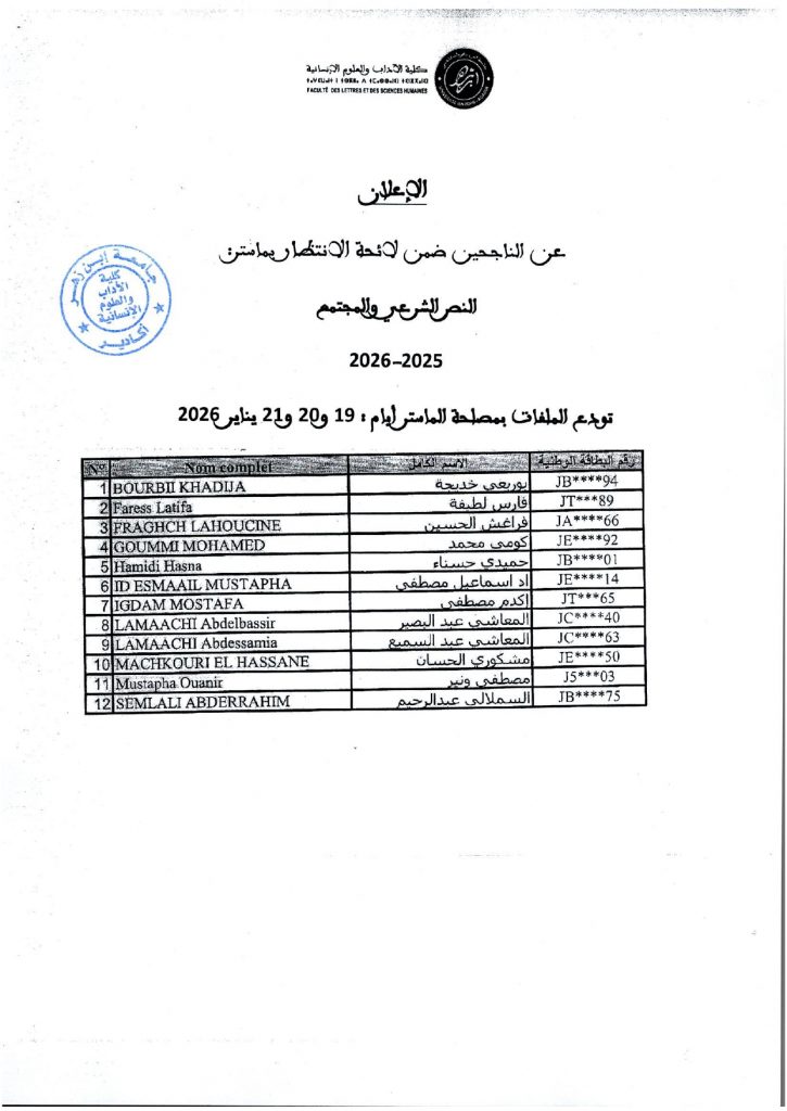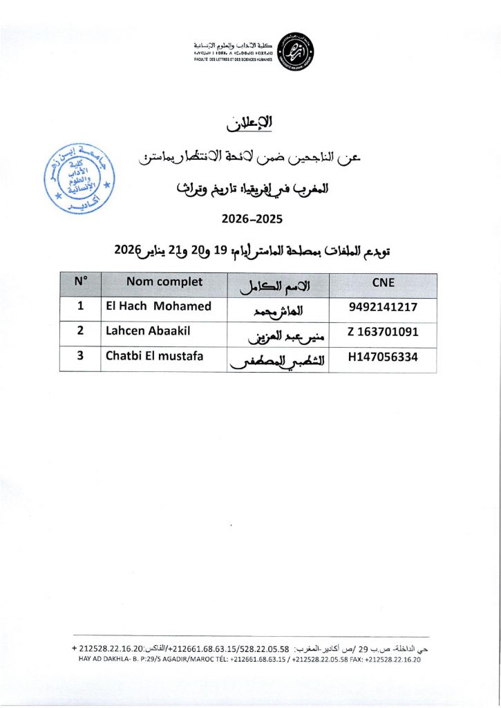 لائحة بأسماء الناجحين لولوج ماستر ( المغرب في إفريقيا : تاريخ وتراث) 2025 – 2026