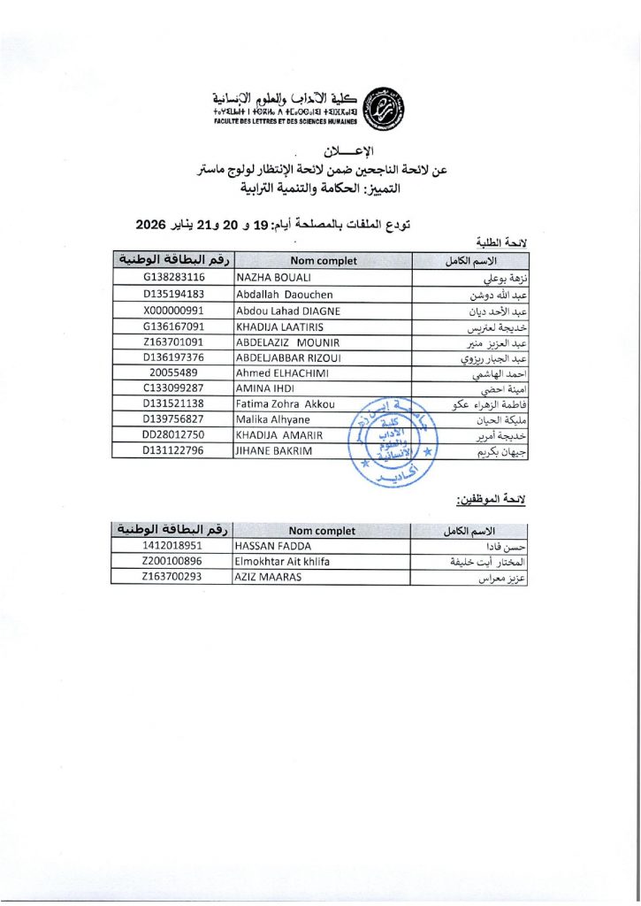 الإعلان عن الناجحين ضمن لائحة الإنتظار لولوج إجازة التميز الحكامة والتنمية الترابية: 2026-2025