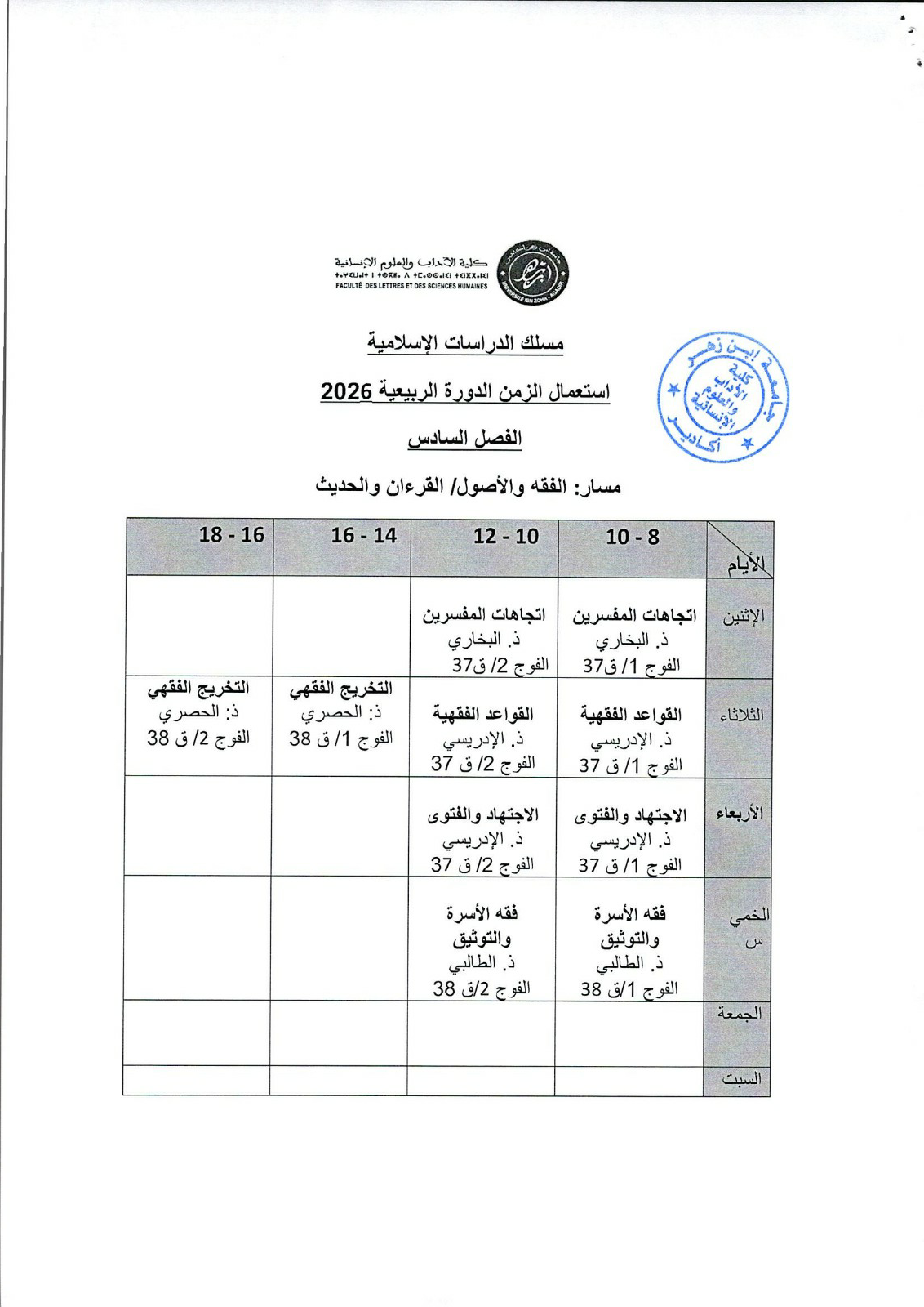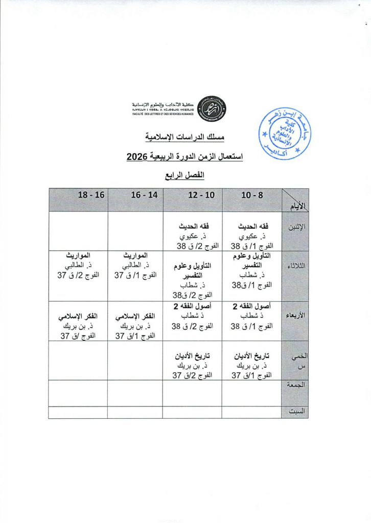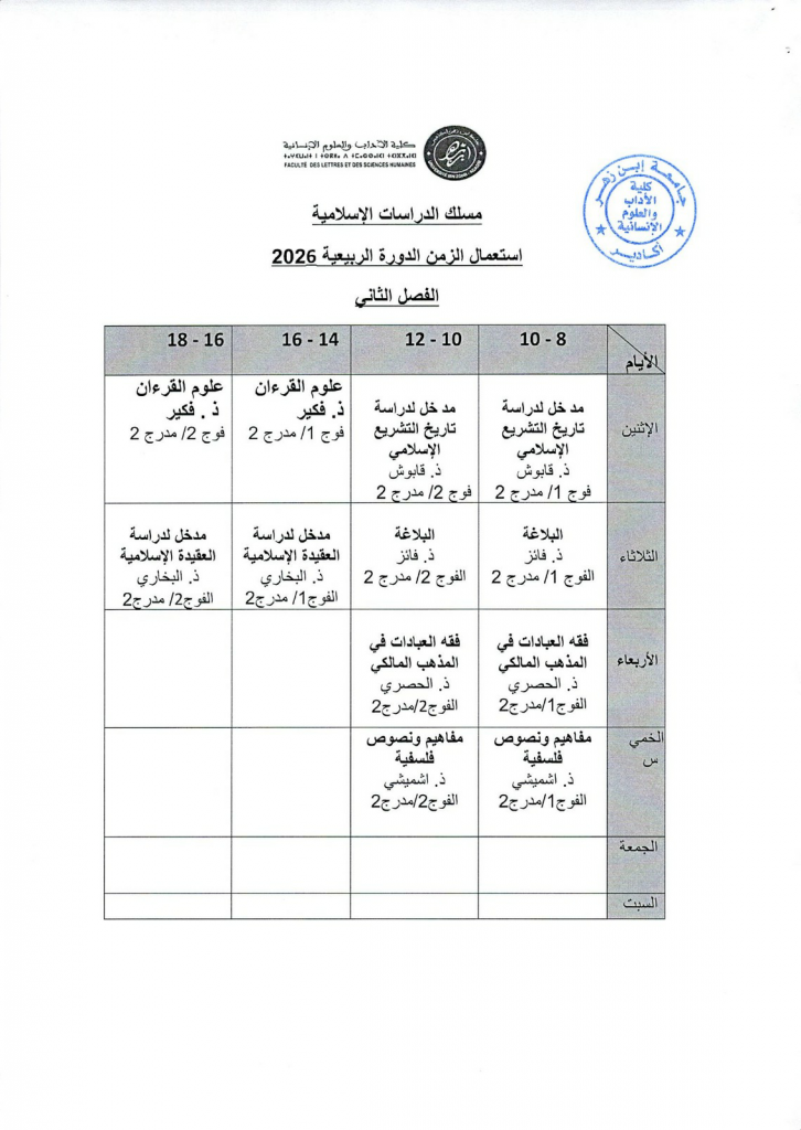 استعمال الزمن شعبة الدراسات الاسلامية