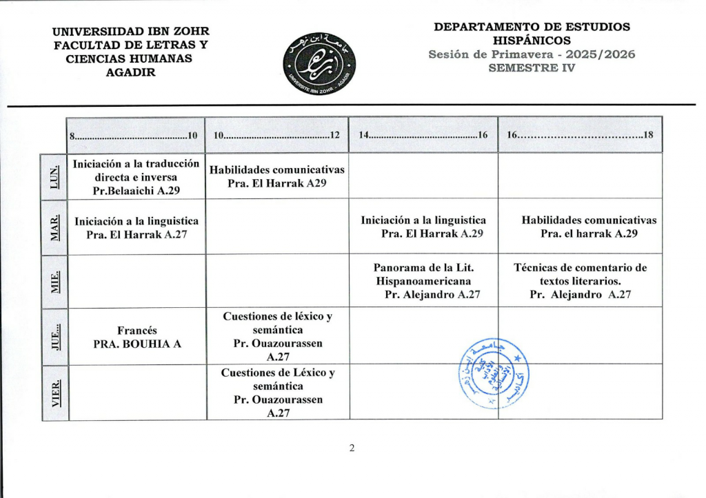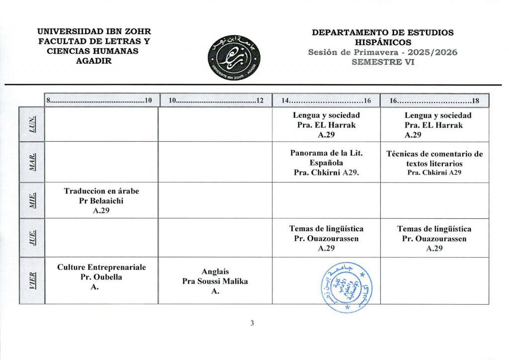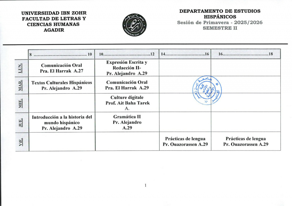 استعمال الزمن شعبة الدراسات الإسبانية