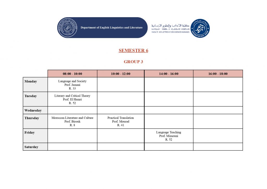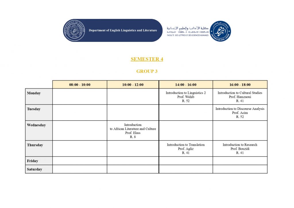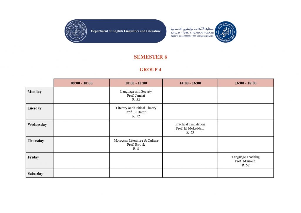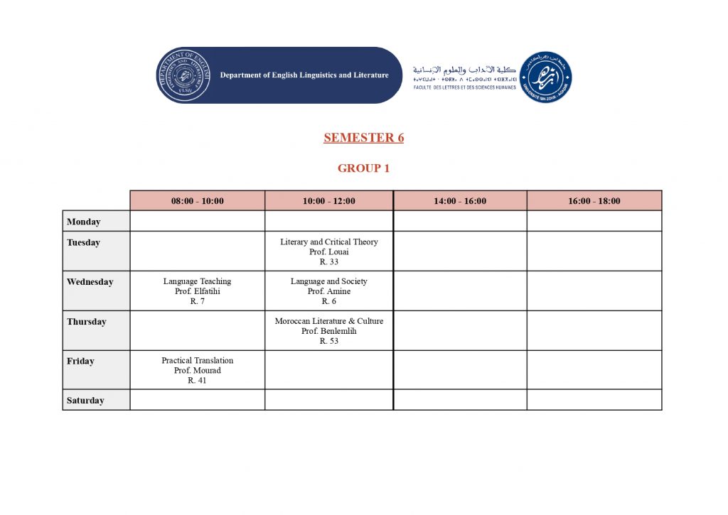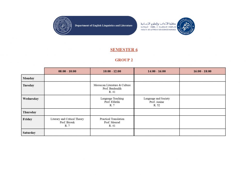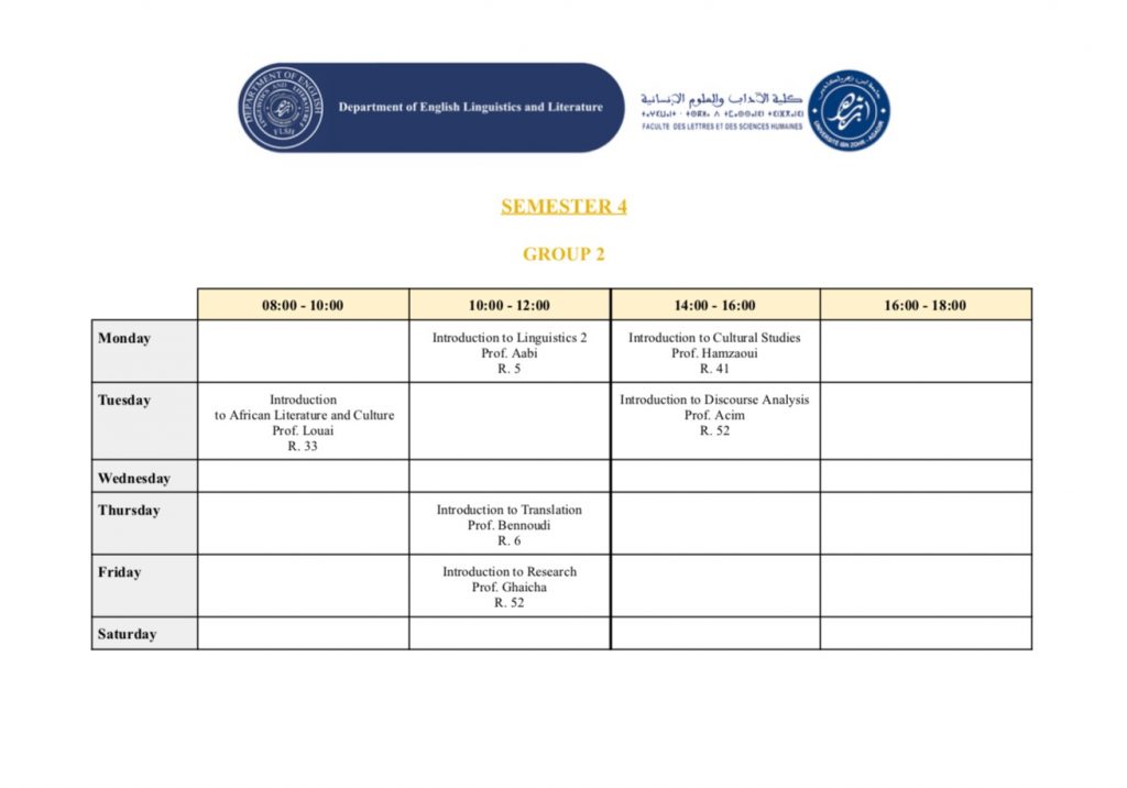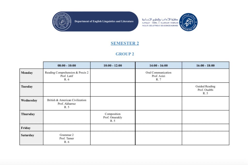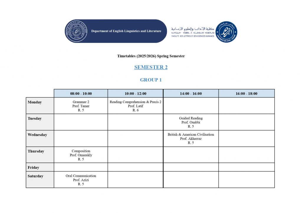 استعمال الزمن – شعبة الدراسات الإنجليزية (English Studies) – الدورة الربيعية -الموسم الجامعي 2025/2026