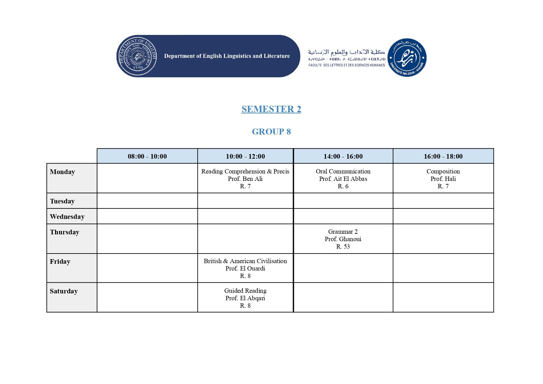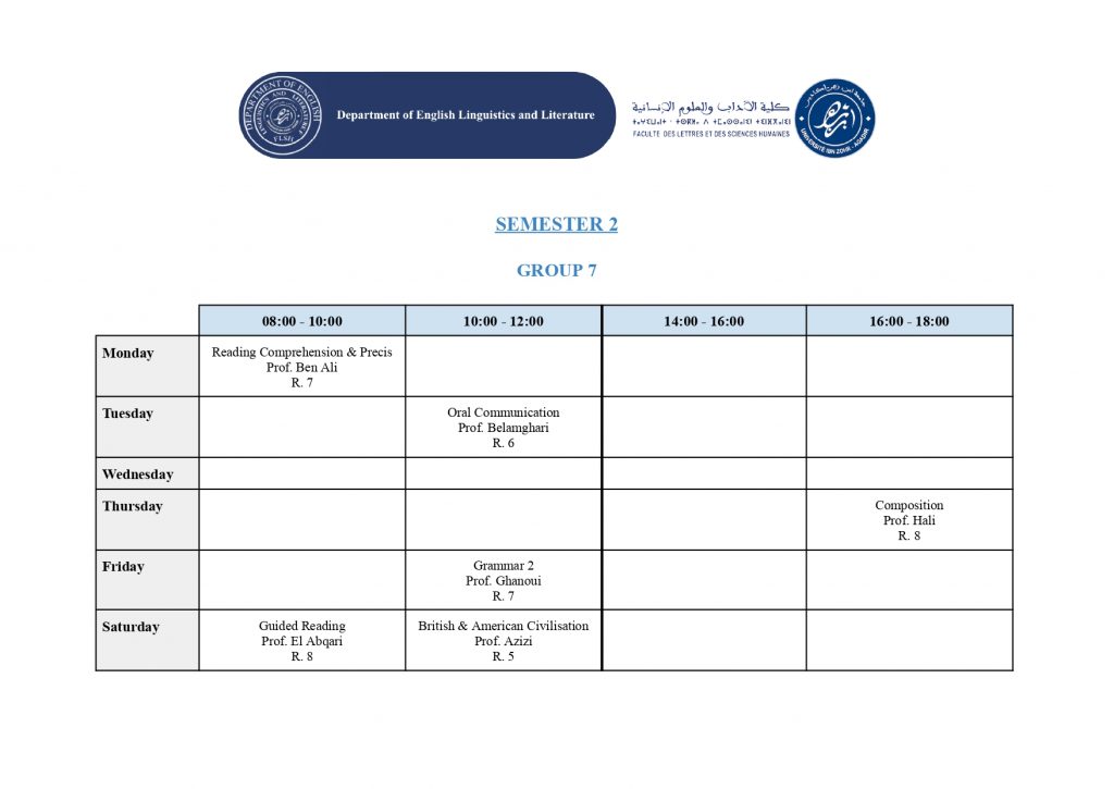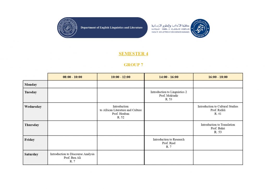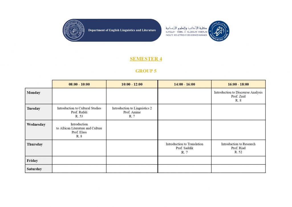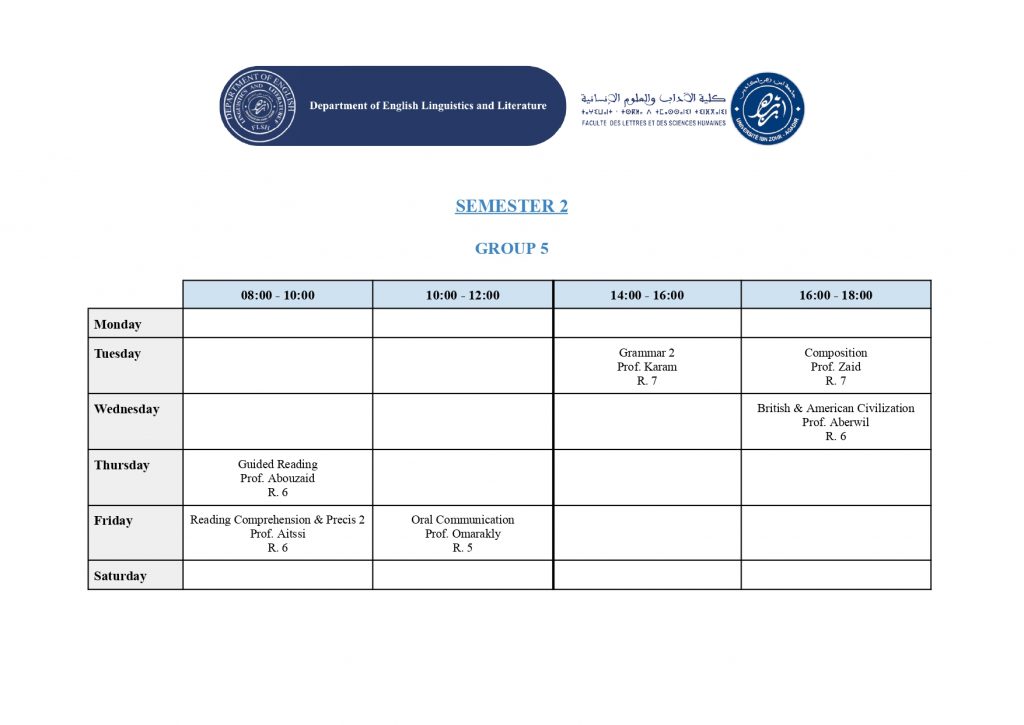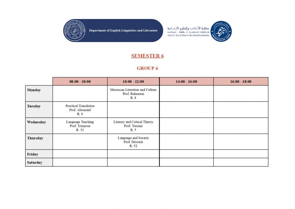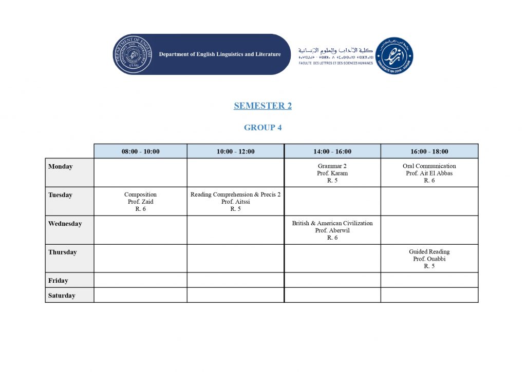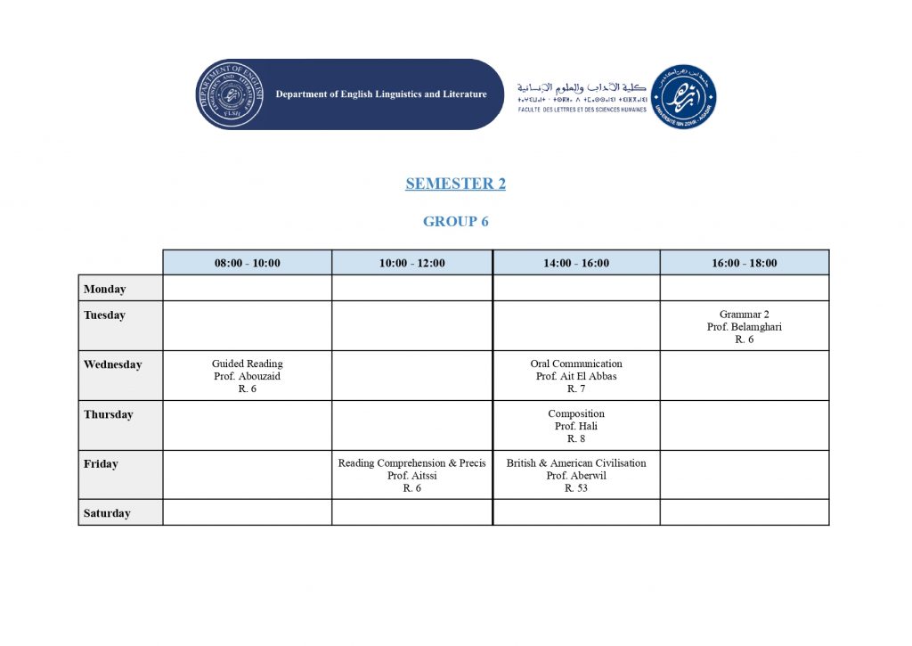 استعمال الزمن – شعبة الدراسات الإنجليزية (English Studies) – الدورة الربيعية -الموسم الجامعي 2025/2026