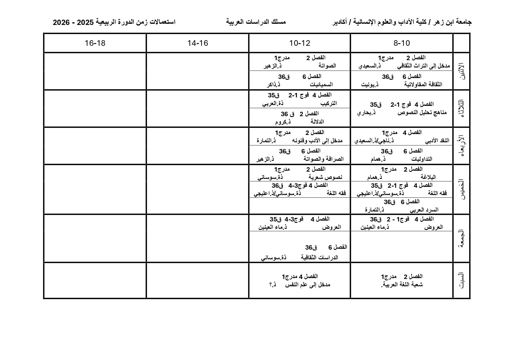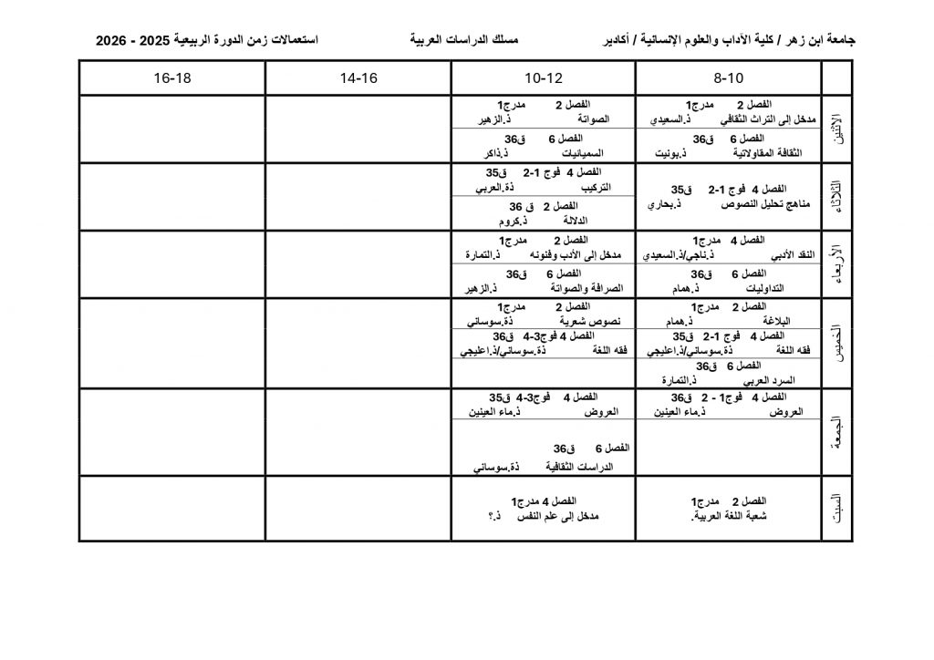استعمال الزمن شعبة الدراسات العربية