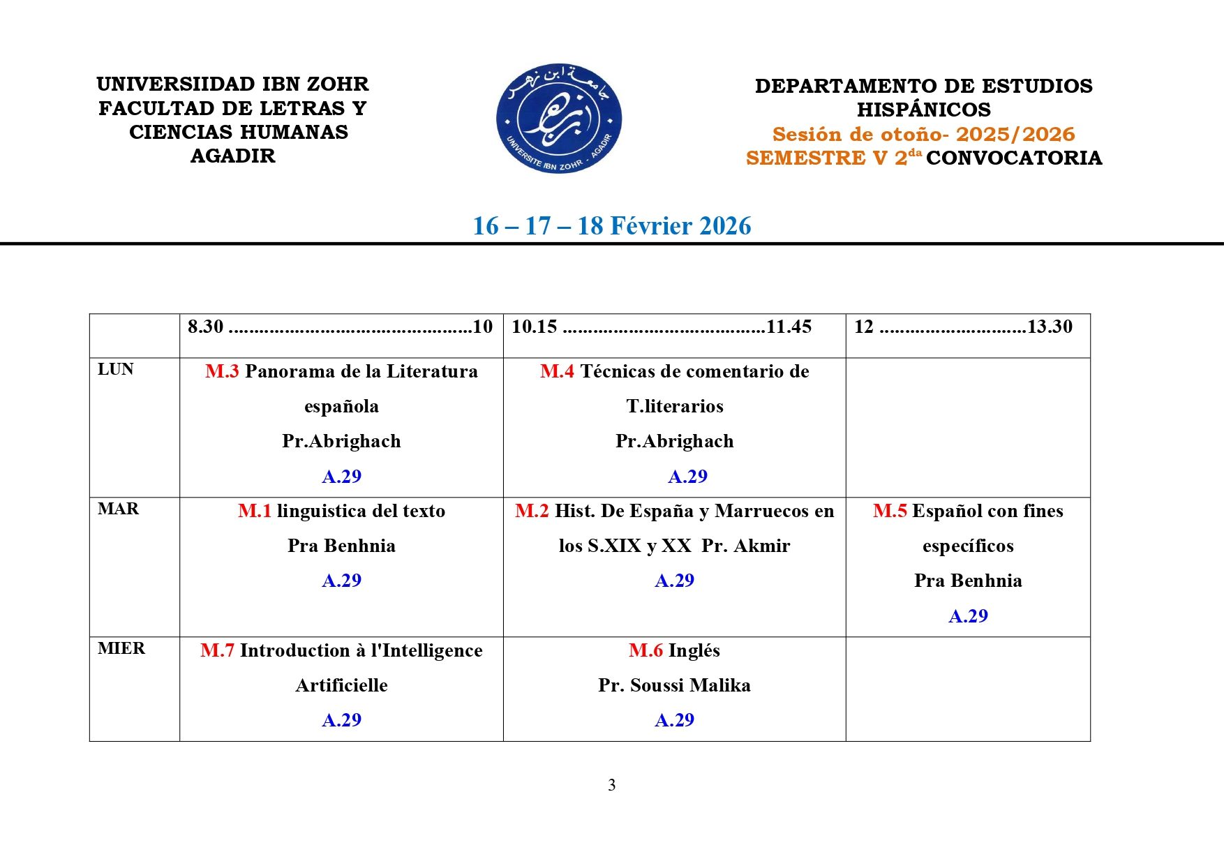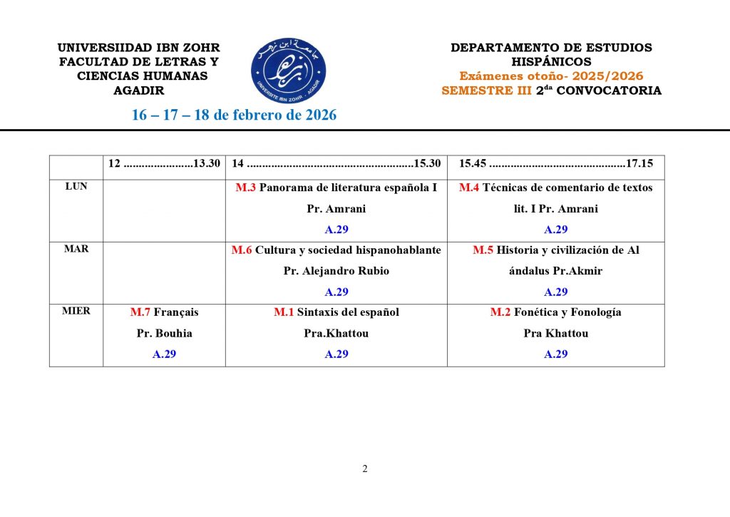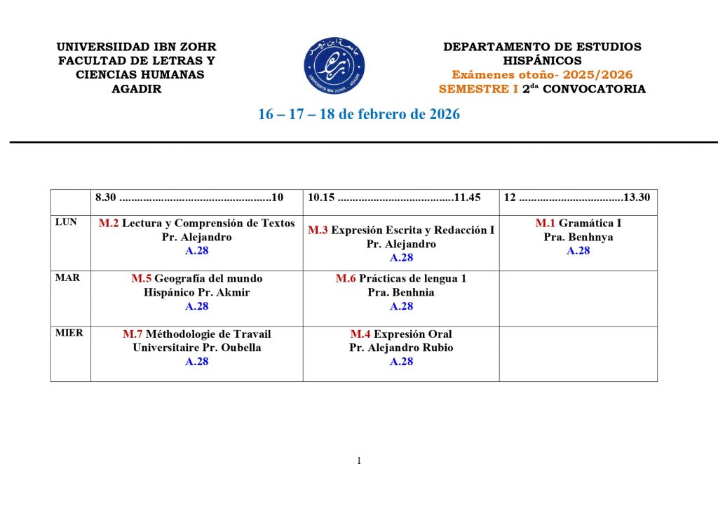 برنامج امتحانات الدورة الخريفية الاستدراكية: Filología Hispánica 2025-2026