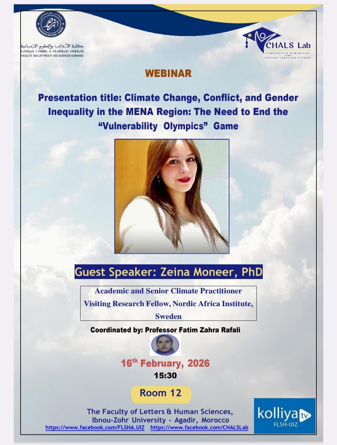 Une discussion académique passionnante est prévue sur un sujet d’actualité, le Maroc ayant récemment subi les conséquences critiques du changement climatique. La docteure Zeina Moneer, de l’Institut Nordique pour l’Afrique, présentera une conférence intitulée « Changement climatique, conflits et inégalités de genre dans la région MENA ».