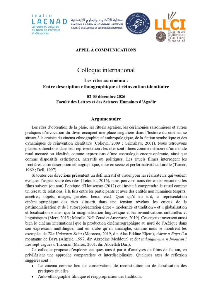 APPEL À COMMUNICATIONS- Colloque international Les rites au cinéma : Entre description ethnographique et réinvention identitaire