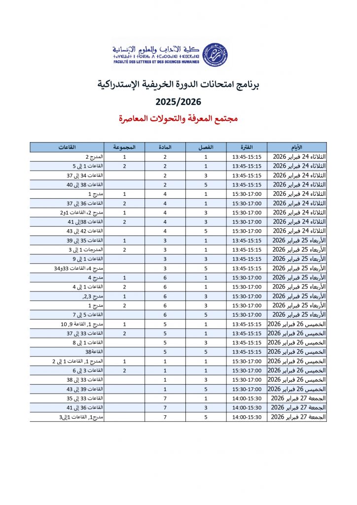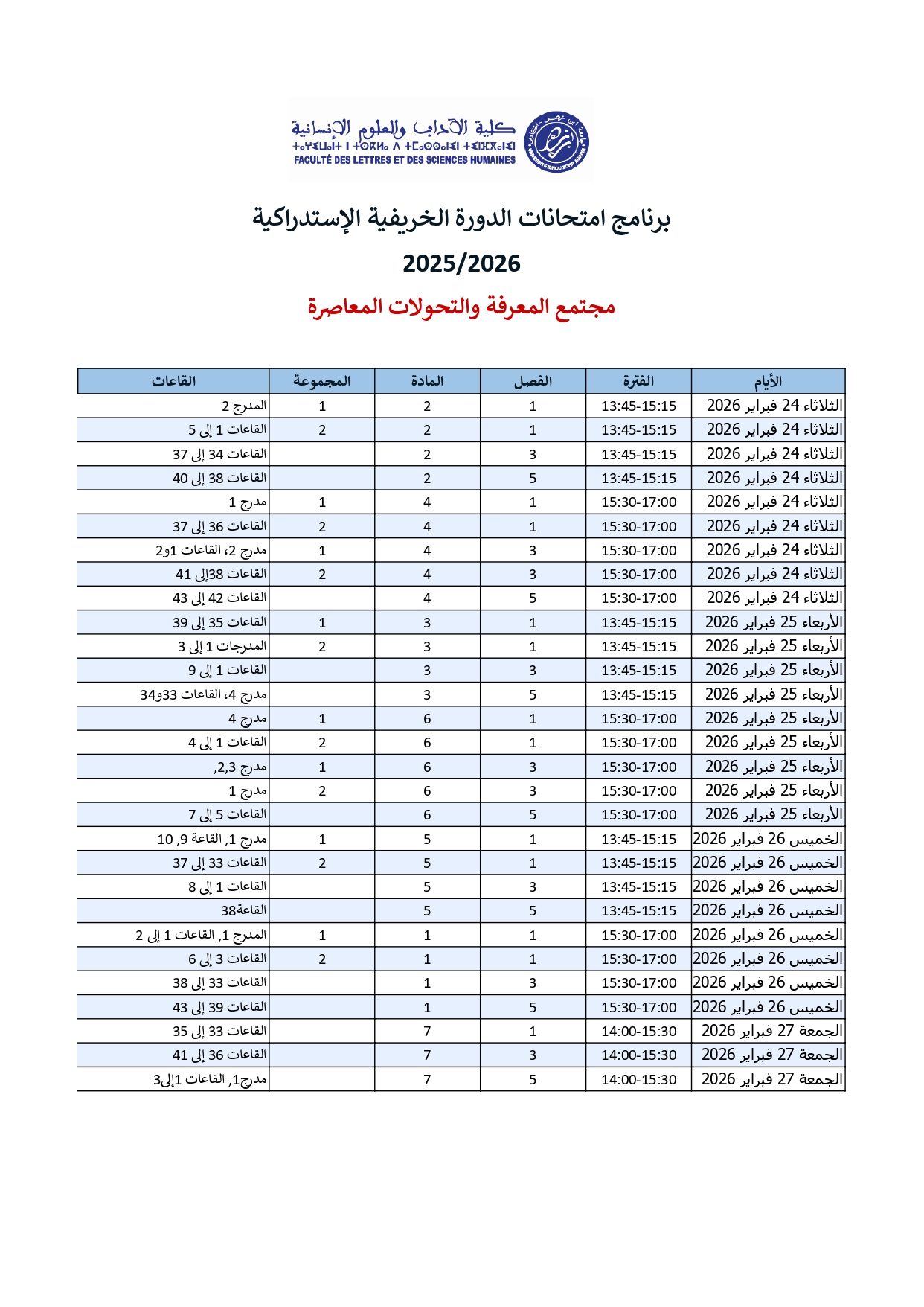 برنامج امتحانات الدورة الخريفية الإستدراكية 2025/2026 – مجتمع المعرفة والتحولات المعاصرة