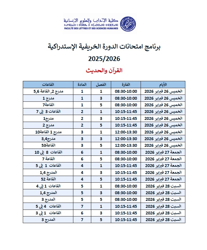 برنامج امتحانات الدورة الخريفية الإستدراكية 2025/2026 القران والحديث