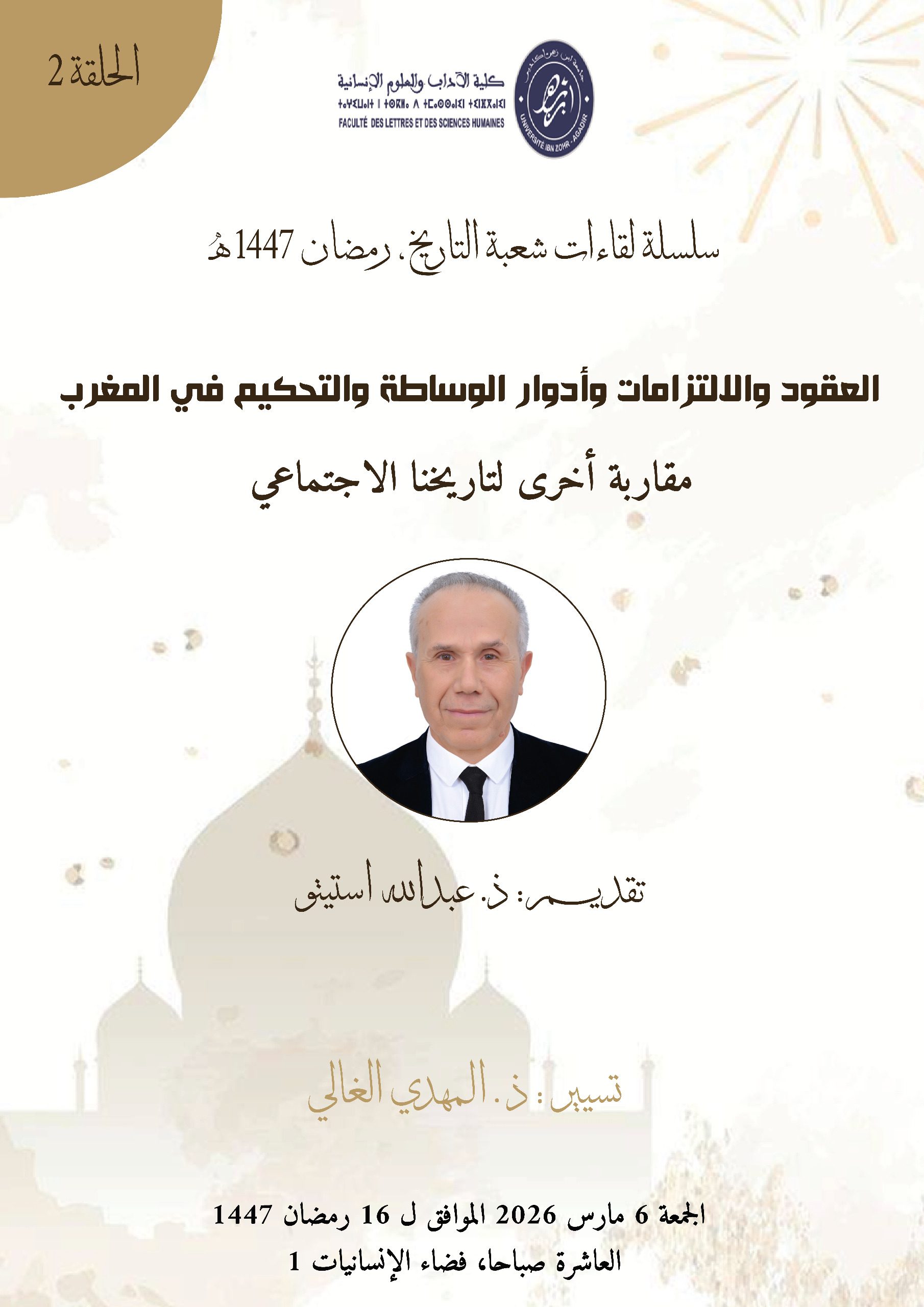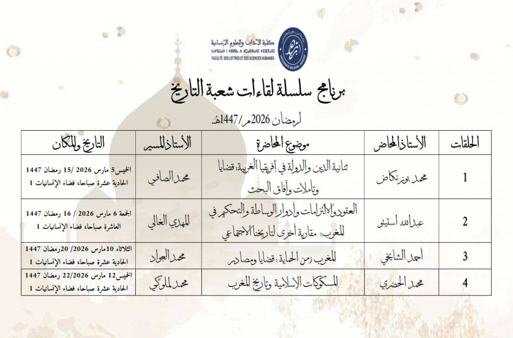 سلسلة لقاءات شعبة التاريخ – رمضان 1447- العقود والالتزامات وادوار الوساطة والتحكيم في المغرب : مقاربه اخرى لتاريخنا الاجتماعي
