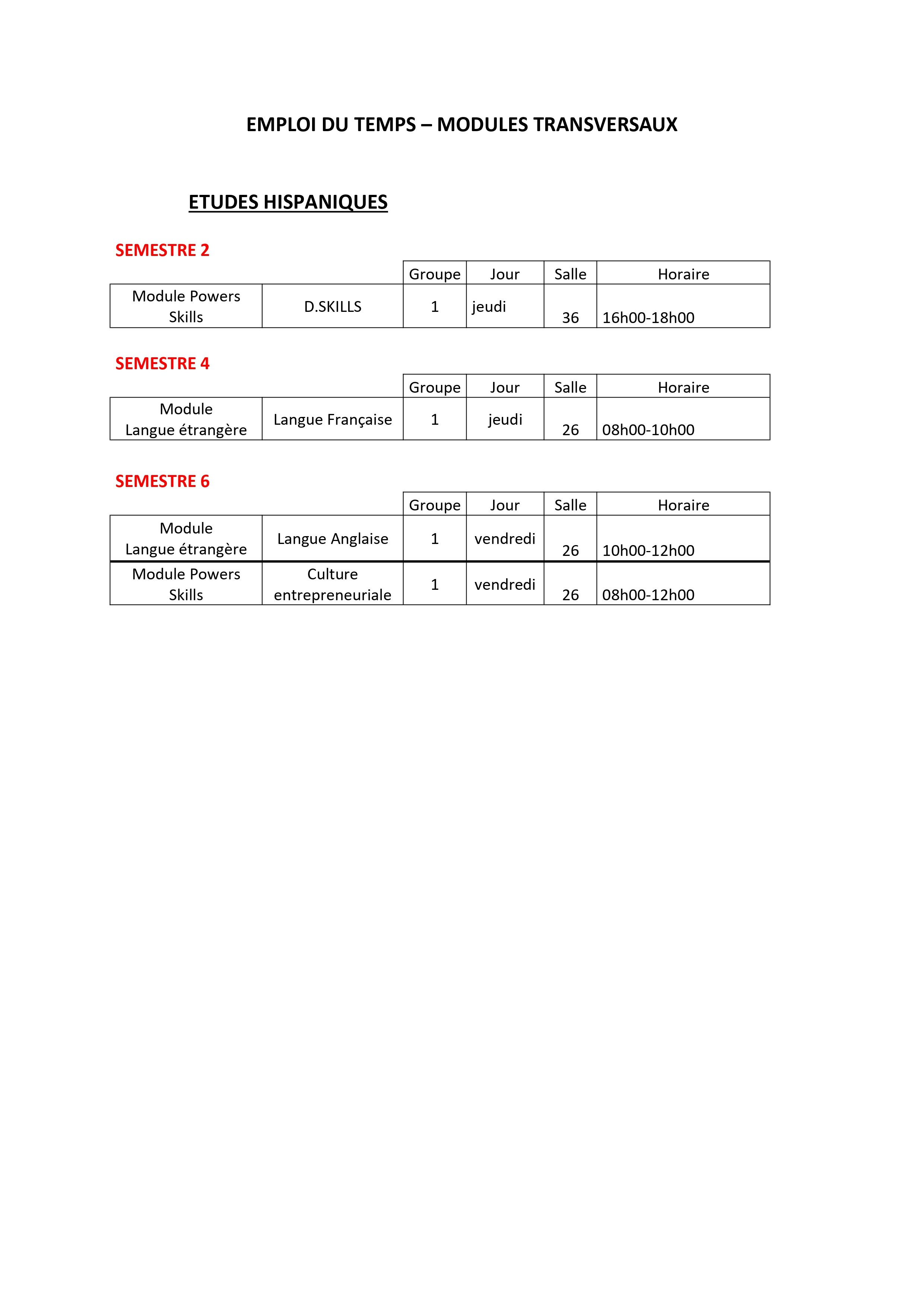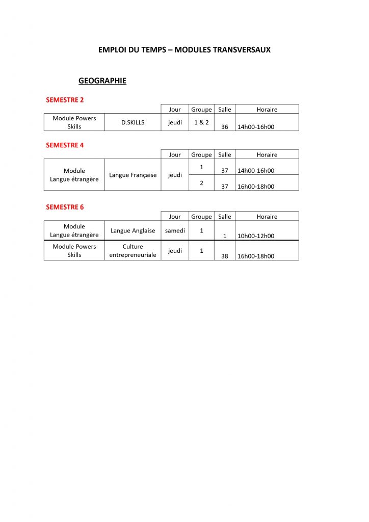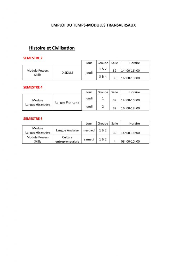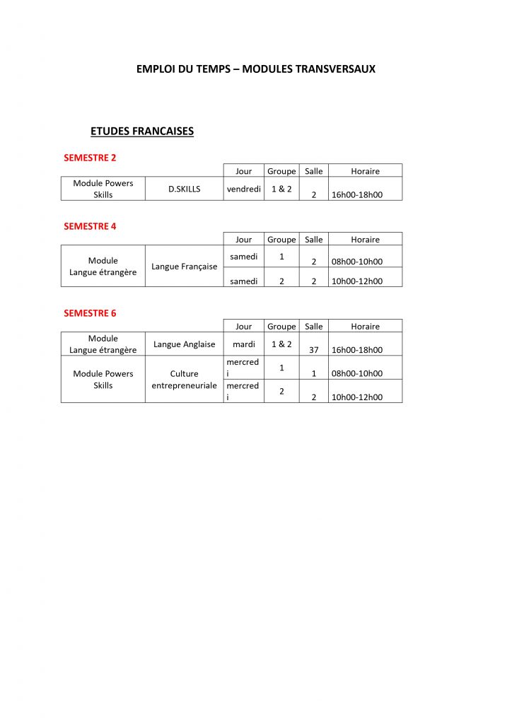 Emploi du temps – MODULES TRANSVERSAUX