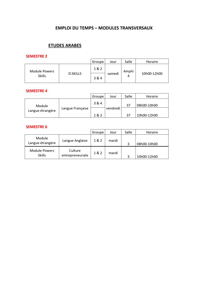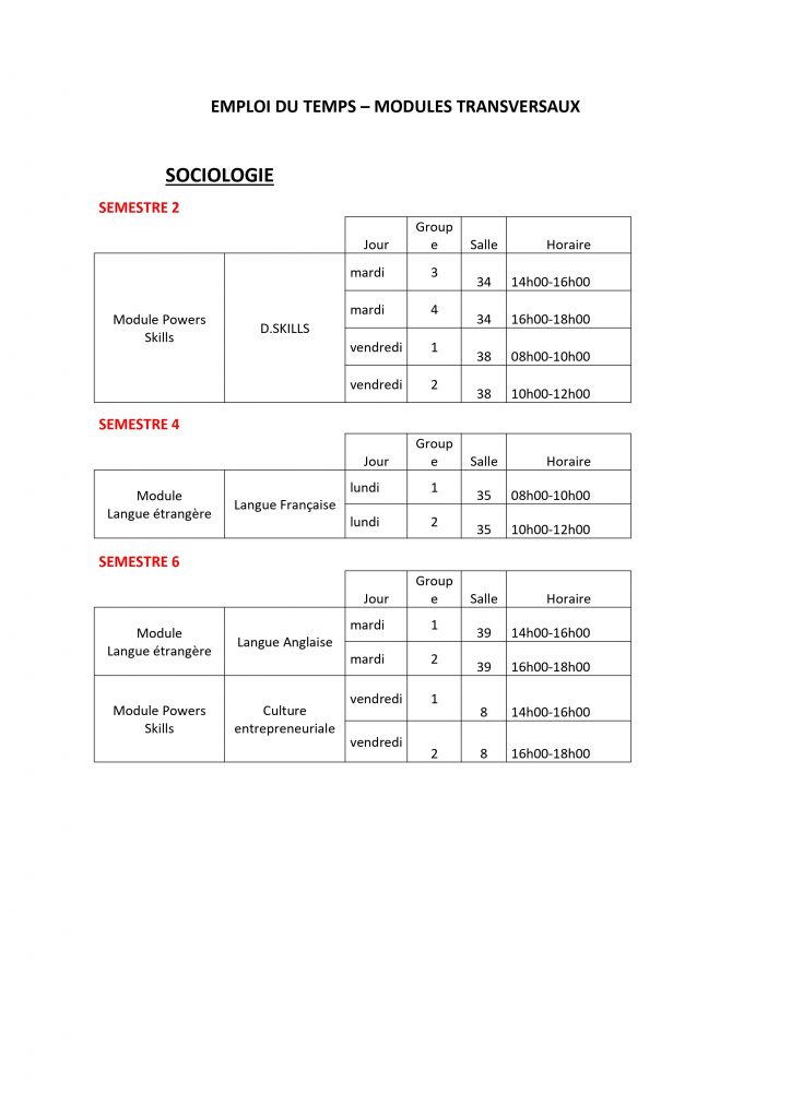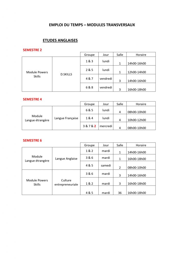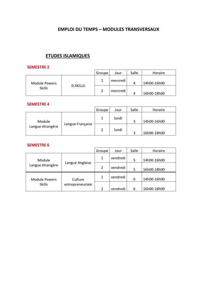 Emploi du temps – MODULES TRANSVERSAUX