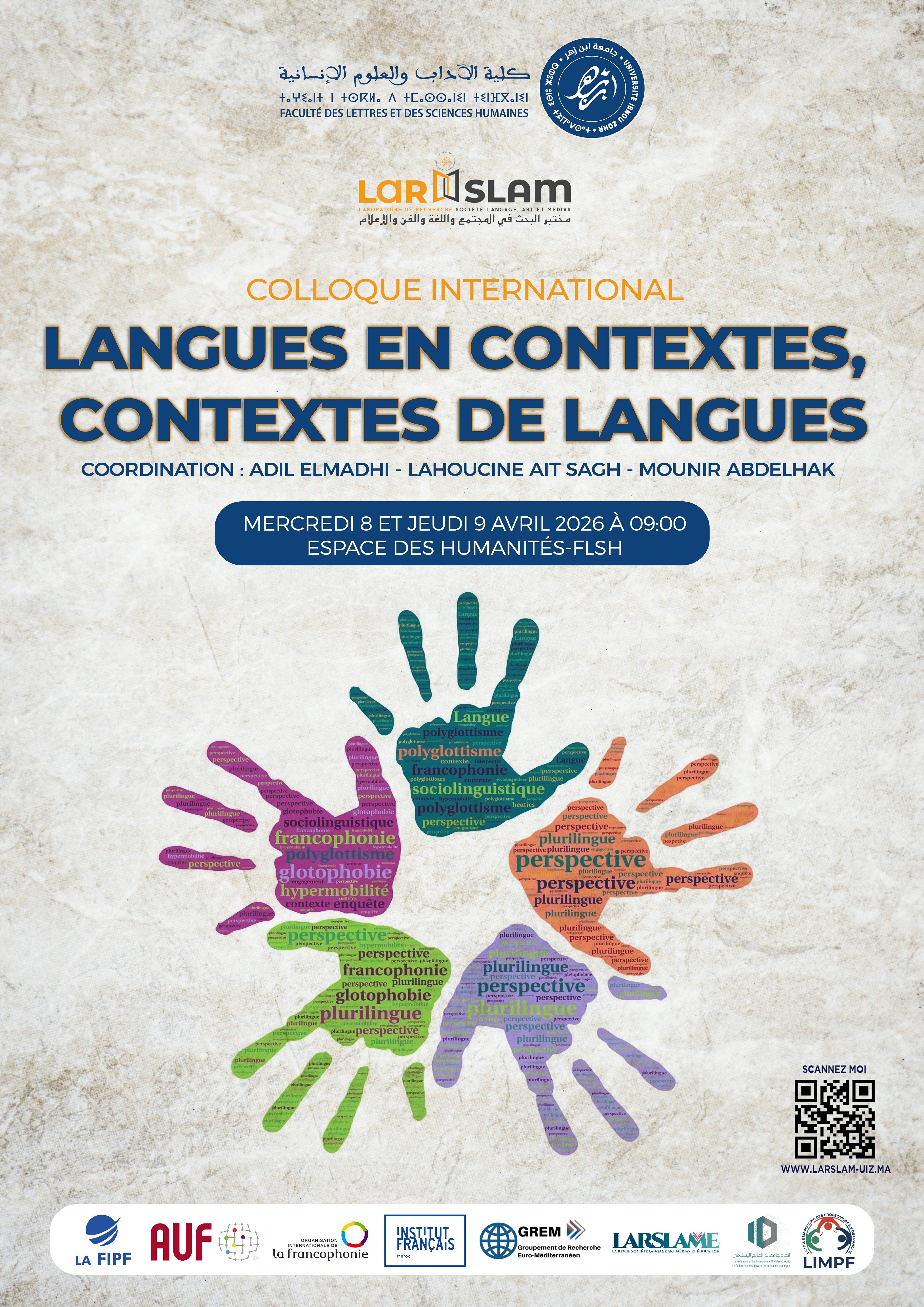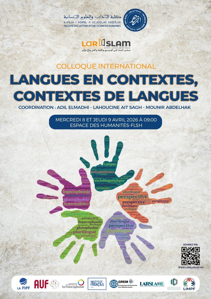 La Faculté des Lettres et des Sciences Humaines (FLSH) de l’Université Ibn Zohr et le laboratoire LARSLAM ont le plaisir d’annoncer la tenue du colloque international intitulé « Langues en contextes, contextes de langues ». Cet événement scientifique constitue un moment fort de réflexion sociolinguistique et sera l’occasion de rendre un hommage solennel aux travaux de Louis-Jean Calvet, Marielle Rispail et Abdelouahad Mabrour.